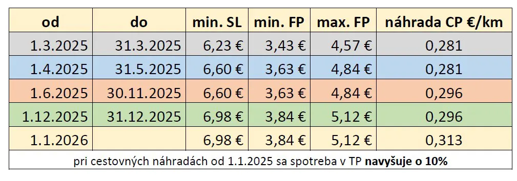 Minimálna výška finančného príspevku na stravovanie, pre rok 2026 je 3,84€. Maximálna daňovú uznaná je 5,12€.